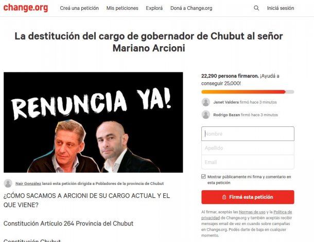 En la mañana de hoy la usuaria de Change.org, Nair González, inició una petición dirigida a pobladores de la provincia de Chubut en la que solicita firmas para solicitar la renuncia del gobernador Mariano Arcioni.