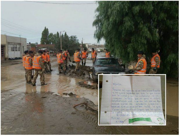 Una pequeña llamada "Victoria Zapata" conmocionada por el accionar del Ejército y agradecida por la tarea que desempeñan los soldados en medio del temporal, decidió escribir una carta y acompañarla con un dibujo.