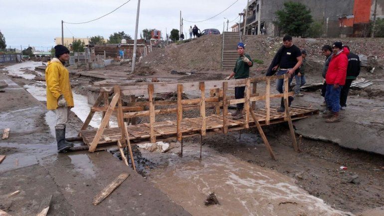 Siendo el barrio Moure uno de los sectores más castigados por el temporal, un grupo de jóvenes decidieron construir ellos mismos un puente- sobre la calle Wilfredo Andrade- para asegurar la transitabilidad de la gente.